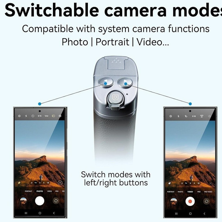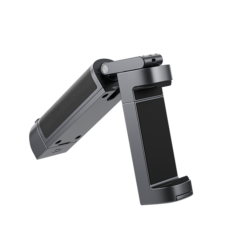 ۱. حالت گریپ دستی (Handle Mode) طراحی ارگونومیک با روکش چرمی و بدنه آلومینیومی، که دستتون رو خسته نمیکنه. برای عکاسی و فیلمبرداری تکدستی عالیه و ثبات بیشتری به گوشی میده. دکمههای کنترل بلوتوثی برای شاتر، زوم و سوئیچ دوربین (در اندروید و HarmonyOS).