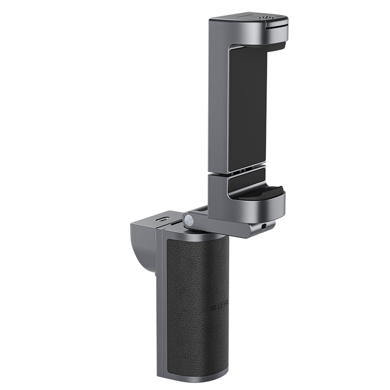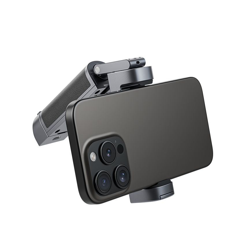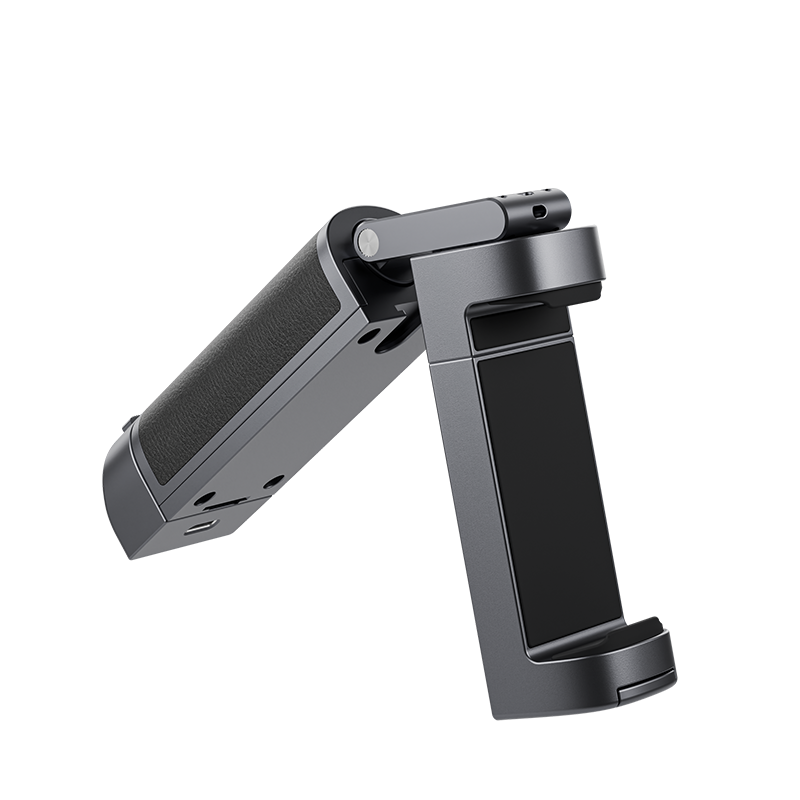۱. حالت گریپ دستی (Handle Mode) طراحی ارگونومیک با روکش چرمی و بدنه آلومینیومی، که دستتون رو خسته نمیکنه. برای عکاسی و فیلمبرداری تکدستی عالیه و ثبات بیشتری به گوشی میده. دکمههای کنترل بلوتوثی برای شاتر، زوم و سوئیچ دوربین (در اندروید و HarmonyOS).