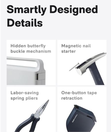 جعبهابزار HOTO QWSGJ002 یک ست کامل و جمعوجور ابزارهای ضروری برای کارهای روزمرهٔ خانه است. این محصول برای تعمیرات سبک، مونتاژ وسایل، DIY، نگهداری خانه و کارهای کوچک طراحی شده است. بدنهٔ جعبه از پلاستیک ABS مقاوم ساخته شده و حمل آن بسیار آسان است.