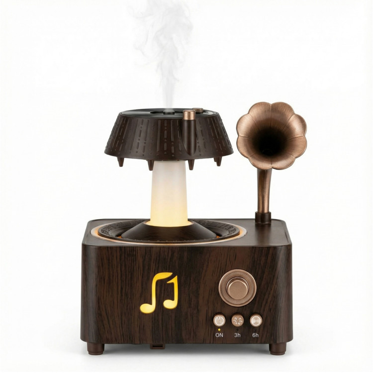 اسپیکر رومیزی طرح گرامافون با افکت بخار و رقص نور ترکیبی از موسیقی، آرامش و طراحی هنری