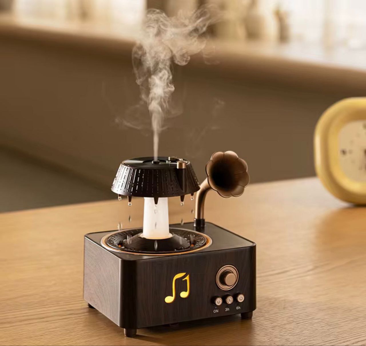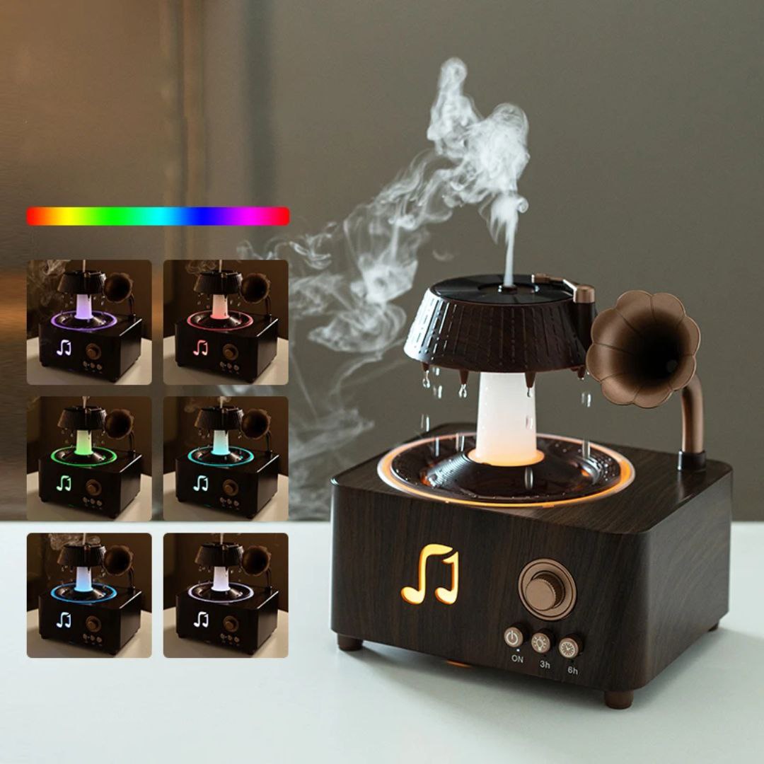 اسپیکر رومیزی طرح گرامافون با افکت بخار و رقص نور ترکیبی از موسیقی، آرامش و طراحی هنری