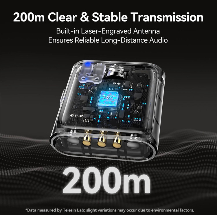 این مجموعه به صورت Plug-and-Play طراحی شده و از یک گیرنده Type-C بهره میبرد که سازگاری گستردهای با انواع دستگاههای مجهز به این پورت دارد؛ از جمله گوشیهای هوشمند اندروید، آیفونهای سری 15 و بالاتر، تبلتها و لپتاپها. میکروفون دکمهای تلسین، با استفاده از فناوری بلوتوث پیشرفته و آنتن لیزری دقیق، بردی خارقالعاده تا 200 متر را در خط دید مستقیم فراهم میکند. این برد فوقالعاده طولانی، آن را برای پوشش دادن فواصل زیاد در هنگام ضبط محتوای فضای باز یا مصاحبههای میدانی ایدهآل میسازد، در حالی که تأخیر صوتی بسیار کم (کمتر از 24 میلیثانیه) پایداری و همگامسازی صدا و تصویر را برای استریمهای زنده و ویدیوها تضمین میکند.