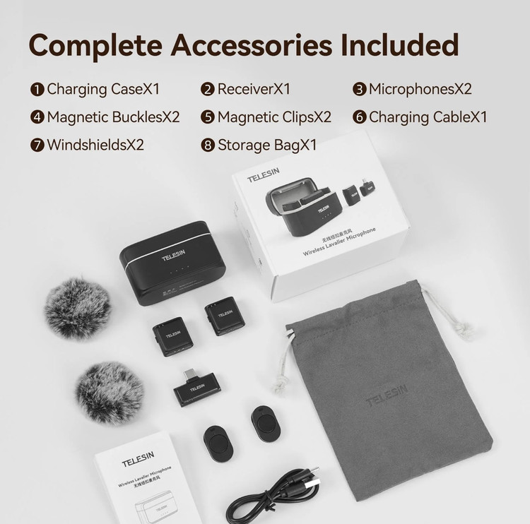 • کیس شارژ • گیرنده Type-C • دو عدد میکروفون • دو عدد گیره مغناطیسی • دو عدد قلاب مغناطیسی • دو عدد بادگیر/فیلتر ضد باد • کابل شارژ • کیف نگهداری