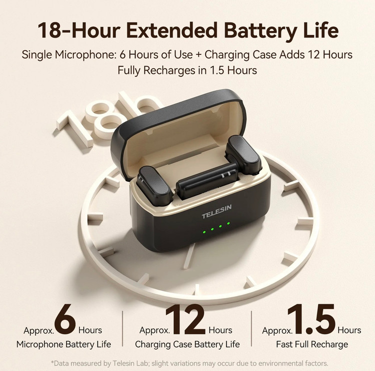این میکروفون با هدف پشتیبانی از تولیدکنندگان محتوای پرکار طراحی شده است. هر فرستنده میکروفون تا 6 ساعت کارکرد مداوم را با یک بار شارژ فراهم میکند. این مجموعه با داشتن کیس شارژر قابل حمل که به تنهایی 12 ساعت شارژ اضافی به میکروفونها میدهد، مجموعاً تا 18 ساعت کارکرد را تضمین مینماید. هم میکروفونها و هم کیس شارژ تنها در حدود 1.5 ساعت به طور کامل شارژ میشوند.