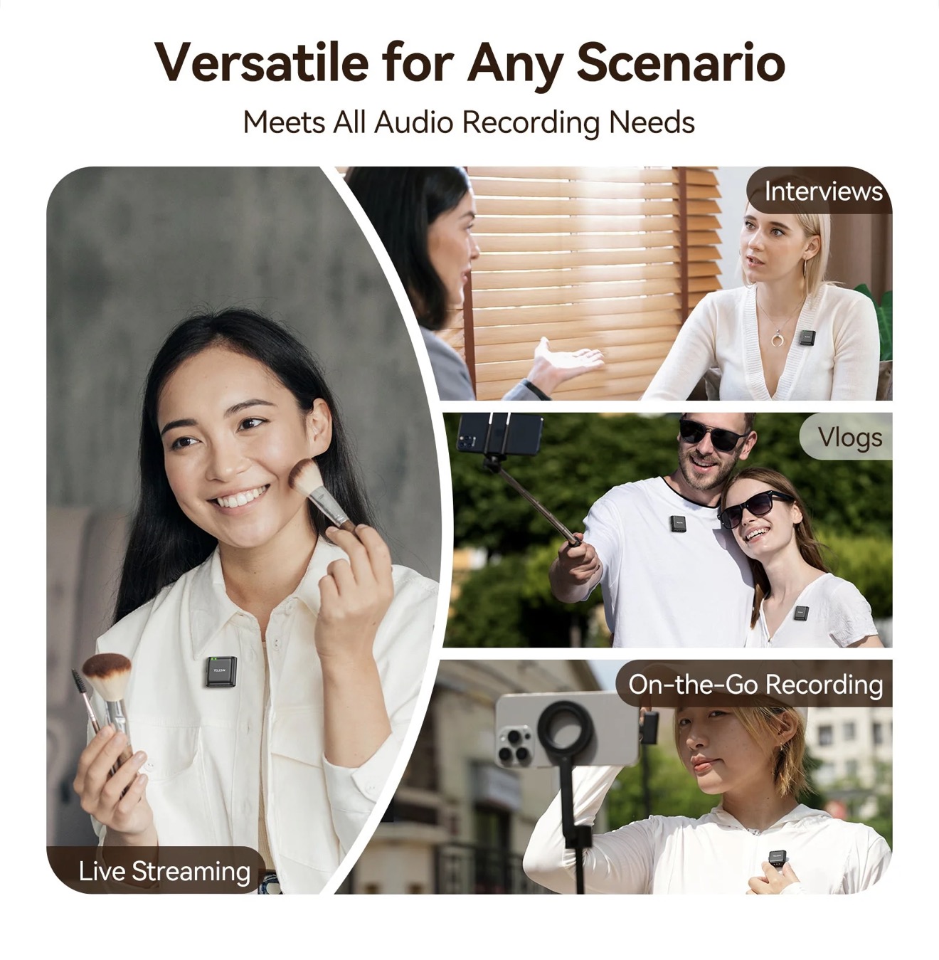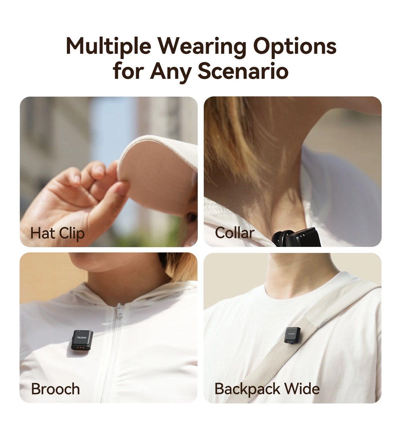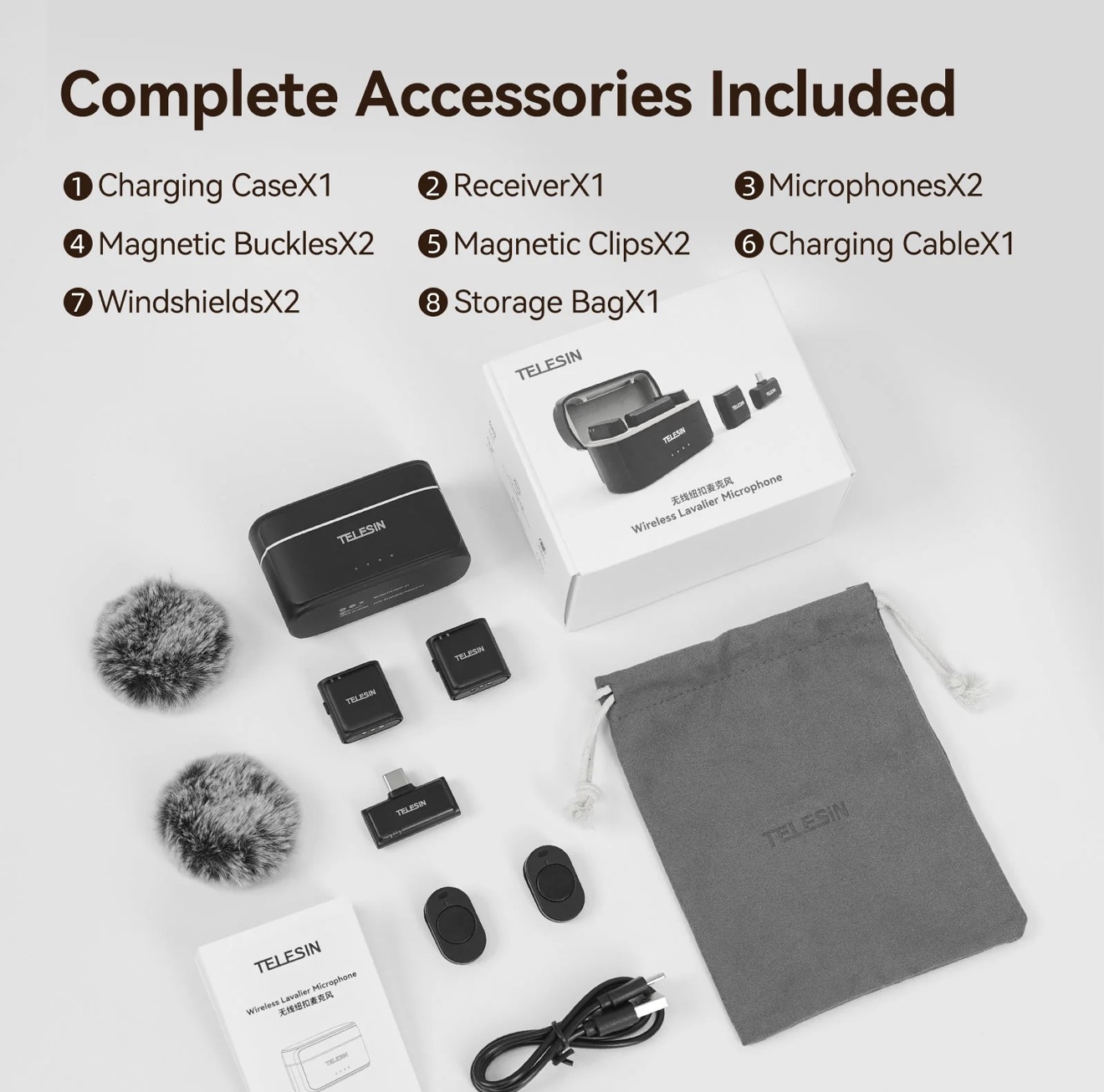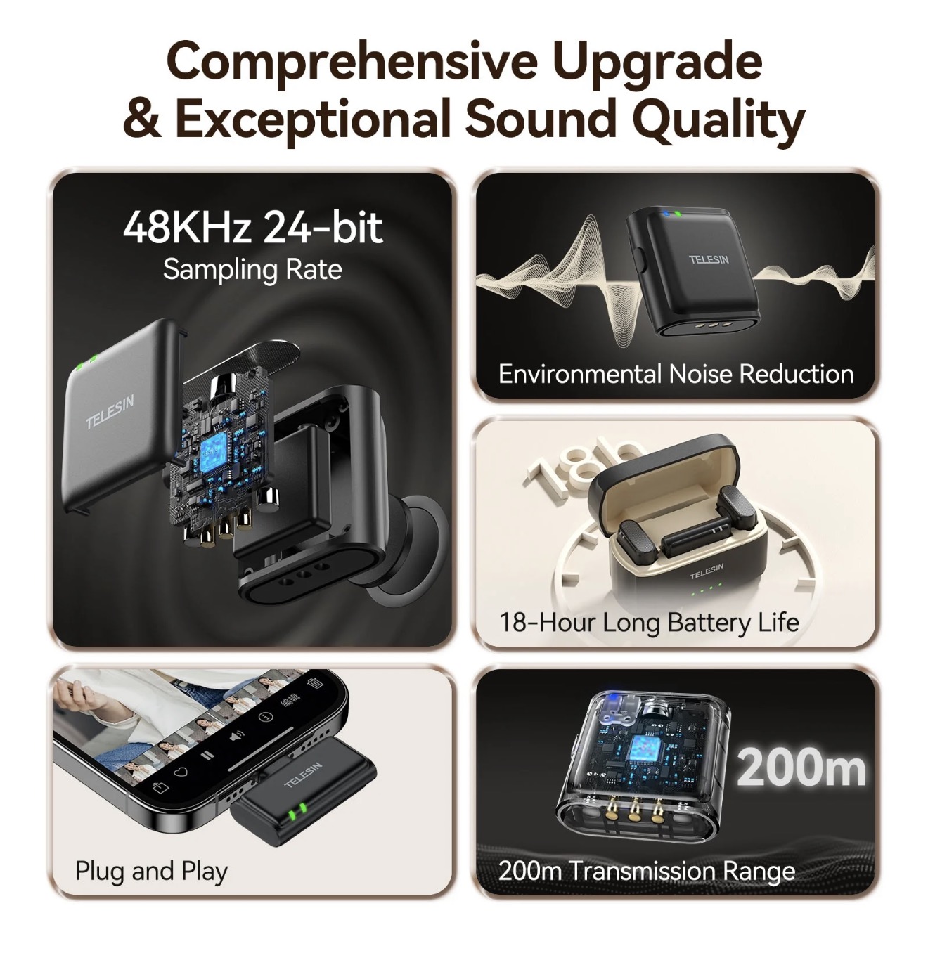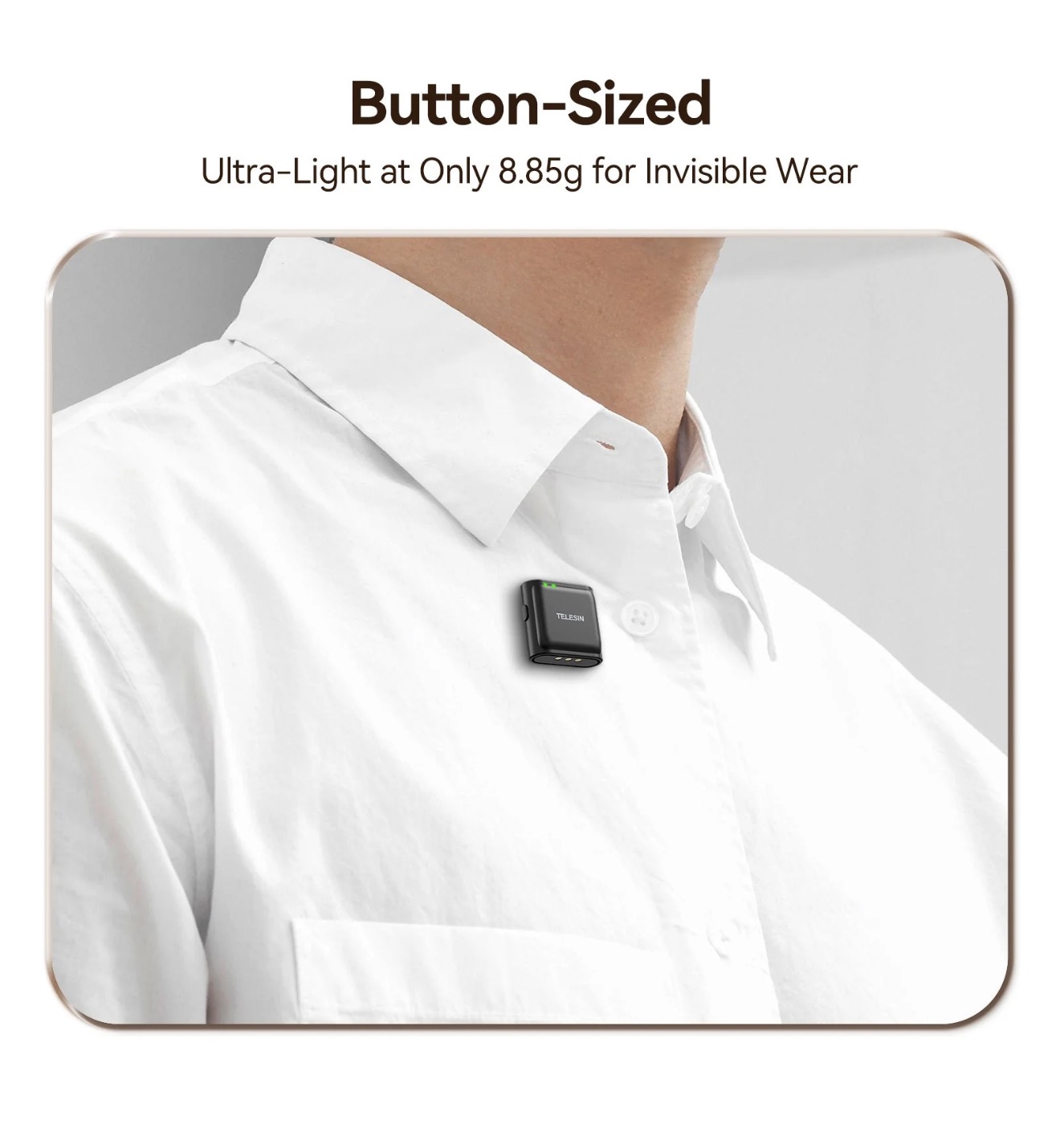 این مجموعه به صورت Plug-and-Play طراحی شده و از یک گیرنده Type-C بهره میبرد که سازگاری گستردهای با انواع دستگاههای مجهز به این پورت دارد؛ از جمله گوشیهای هوشمند اندروید، آیفونهای سری 15 و بالاتر، تبلتها و لپتاپها. میکروفون دکمهای تلسین، با استفاده از فناوری بلوتوث پیشرفته و آنتن لیزری دقیق، بردی خارقالعاده تا 200 متر را در خط دید مستقیم فراهم میکند. این برد فوقالعاده طولانی، آن را برای پوشش دادن فواصل زیاد در هنگام ضبط محتوای فضای باز یا مصاحبههای میدانی ایدهآل میسازد، در حالی که تأخیر صوتی بسیار کم (کمتر از 24 میلیثانیه) پایداری و همگامسازی صدا و تصویر را برای استریمهای زنده و ویدیوها تضمین میکند.