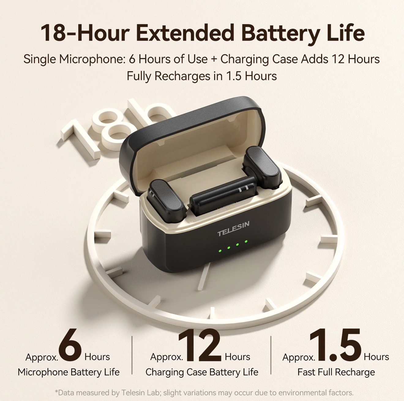 این میکروفون با هدف پشتیبانی از تولیدکنندگان محتوای پرکار طراحی شده است. هر فرستنده میکروفون تا 6 ساعت کارکرد مداوم را با یک بار شارژ فراهم میکند. این مجموعه با داشتن کیس شارژر قابل حمل که به تنهایی 12 ساعت شارژ اضافی به میکروفونها میدهد، مجموعاً تا 18 ساعت کارکرد را تضمین مینماید. هم میکروفونها و هم کیس شارژ تنها در حدود 1.5 ساعت به طور کامل شارژ میشوند.