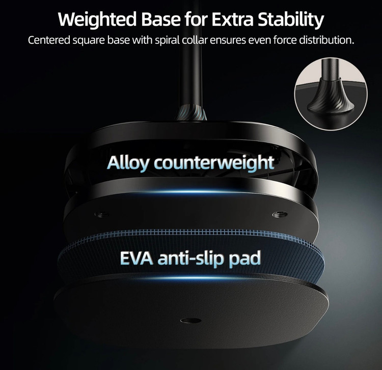 یکی از مهمترین چالشها در پایههای ایستاده، لرزش و عدم پایداری است. P3-FS-01 این مشکل را با طراحی زیر حل کرده است: شاسی مربعی (با ابعاد ۲۶۰x۲۶۰ میلیمتر) وزن محصول حدوداً ۲۳۶۰ گرم را توزیع کرده و پایداری کامل را تضمین میکند تا در حین ضبط، گوشی شما ثابت و بدون لرزش باقی بماند.این پایه قابل جمع شدن است، که جابجایی و ذخیرهسازی آن را آسان و انعطافپذیر میسازد.