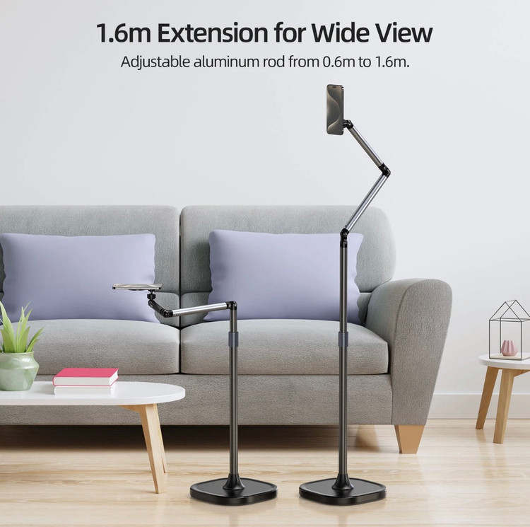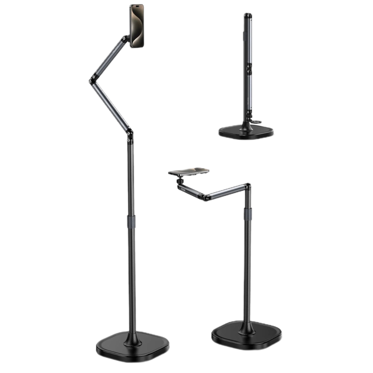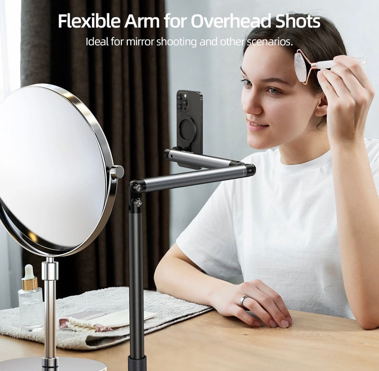 با دامنه ارتفاعی قابل تنظیم تقریباً 60 تا 160 سانتی متر، این پایه به شما امکان میدهد تا گوشی خود را در ارتفاع مناسب برای هر نوع فیلمبرداری تنظیم کنید، از نشستن روی مبل تا ایستادن کامل. محور چرخان میراکننده امکان تنظیم انعطافپذیر و دقیق زوایا را فراهم میکند.به راحتی میتوانید زوایای فیلمبرداری از بالا (Overhead Shooting) یا فیلمبرداری عمودی (Vertical Shooting) را تنظیم کنید تا محتوای خلاقانهای بسازید.
