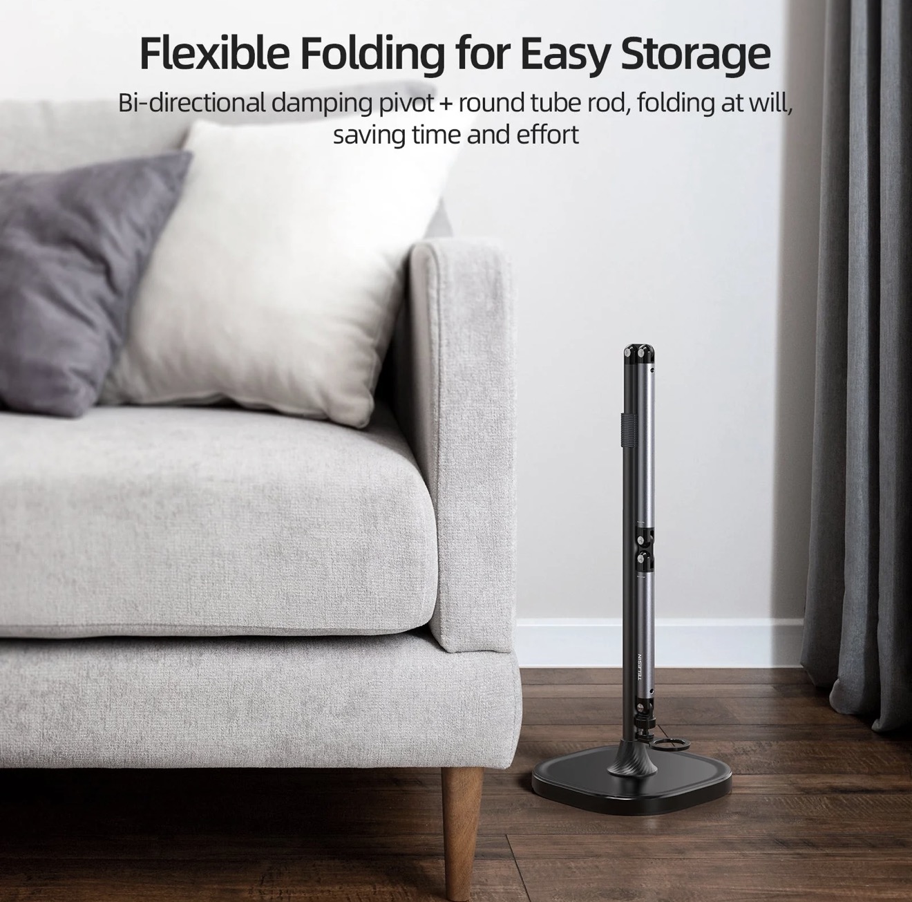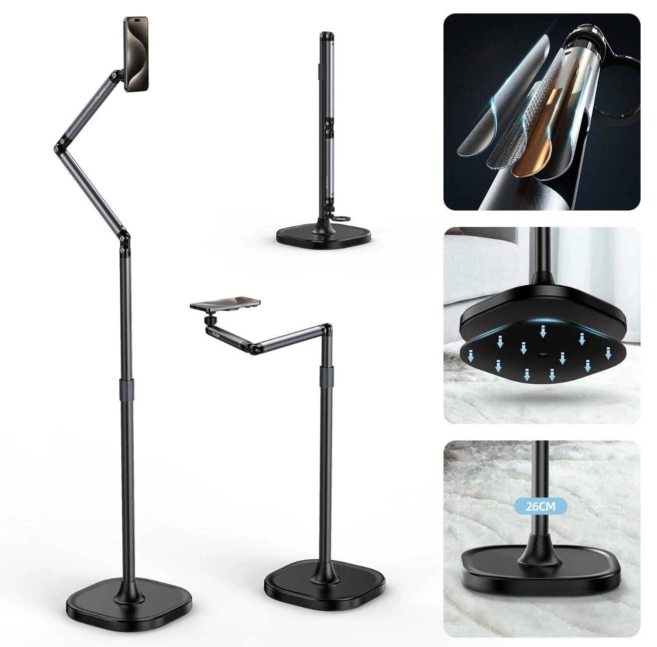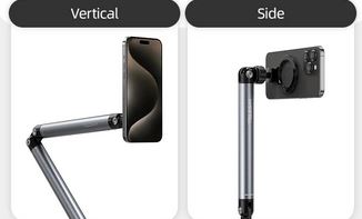با دامنه ارتفاعی قابل تنظیم تقریباً 60 تا 160 سانتی متر، این پایه به شما امکان میدهد تا گوشی خود را در ارتفاع مناسب برای هر نوع فیلمبرداری تنظیم کنید، از نشستن روی مبل تا ایستادن کامل. محور چرخان میراکننده امکان تنظیم انعطافپذیر و دقیق زوایا را فراهم میکند.به راحتی میتوانید زوایای فیلمبرداری از بالا (Overhead Shooting) یا فیلمبرداری عمودی (Vertical Shooting) را تنظیم کنید تا محتوای خلاقانهای بسازید.
