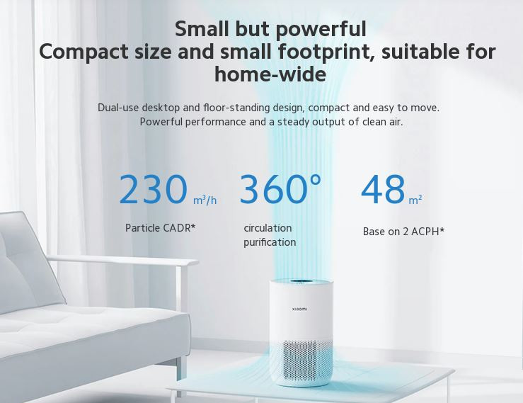 تصفیه هوای شیائومی 4 کامپکت با نرخ تولید هوای پاک تا ۲۳۰ مترمکعب بر ساعت، قادر است هوای محیطهایی با متراژ تقریبی ۱۶ تا ۲۷ متر مربع را بهصورت مؤثر تصفیه کند. این دستگاه ذرات معلق مضر مانند PM2.5، گرد و غبار، دود، گرده گیاهان و آلرژنها را کاهش داده و هوایی سالمتر برای تنفس فراهم میکند.
