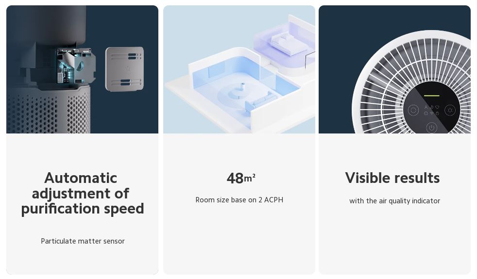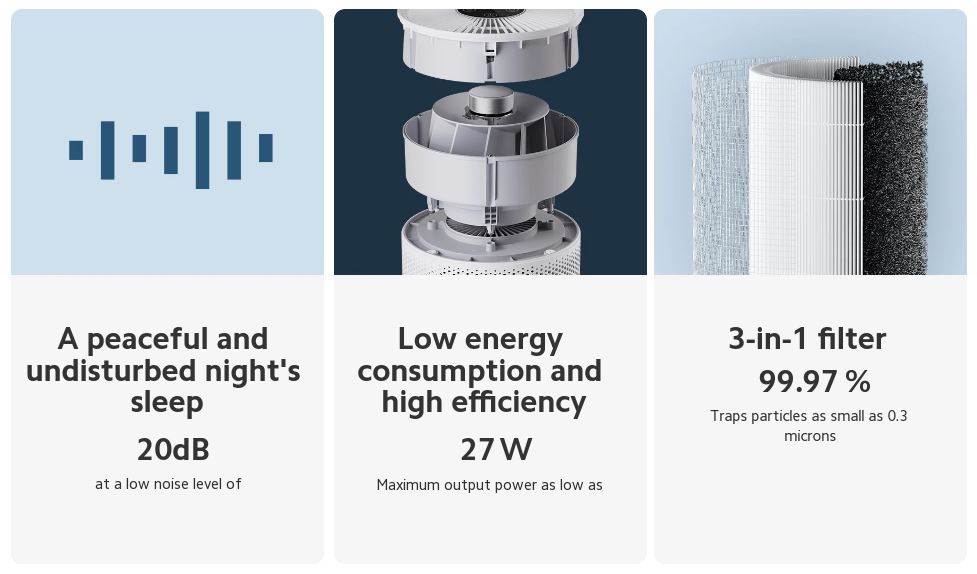 این دستگاه به فیلتر سهمرحلهای مجهز است که شامل فیلتر اولیه برای جذب ذرات درشت، فیلتر با راندمان بالا برای حذف تا ۹۹.۹۷ درصد ذرات بسیار ریز و لایه کربن فعال برای کاهش بوهای نامطبوع میشود. طراحی ورودی هوای ۳۶۰ درجه باعث میشود هوا از تمام جهات وارد دستگاه شده و با سرعت بیشتری تصفیه شود. تعویض فیلتر نیز بهسادگی و از قسمت زیرین دستگاه انجام میشود.