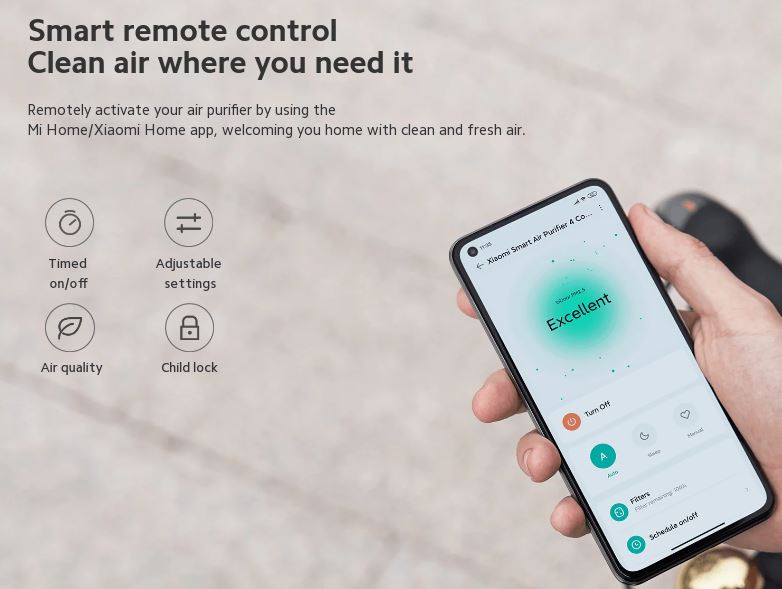 Xiaomi Air Purifier 4 Compact به حسگر لیزری PM2.5 مجهز است که کیفیت هوا را بهصورت لحظهای اندازهگیری میکند. اطلاعات مربوط به وضعیت هوا از طریق نمایشگر LED و همچنین اپلیکیشن Xiaomi Home قابل مشاهده است. کاربر میتواند از طریق این اپلیکیشن دستگاه را کنترل کند، زمانبندی انجام دهد و حالت عملکرد را تغییر دهد. این مدل از دستیارهای صوتی گوگل و الکسا نیز پشتیبانی میکند.