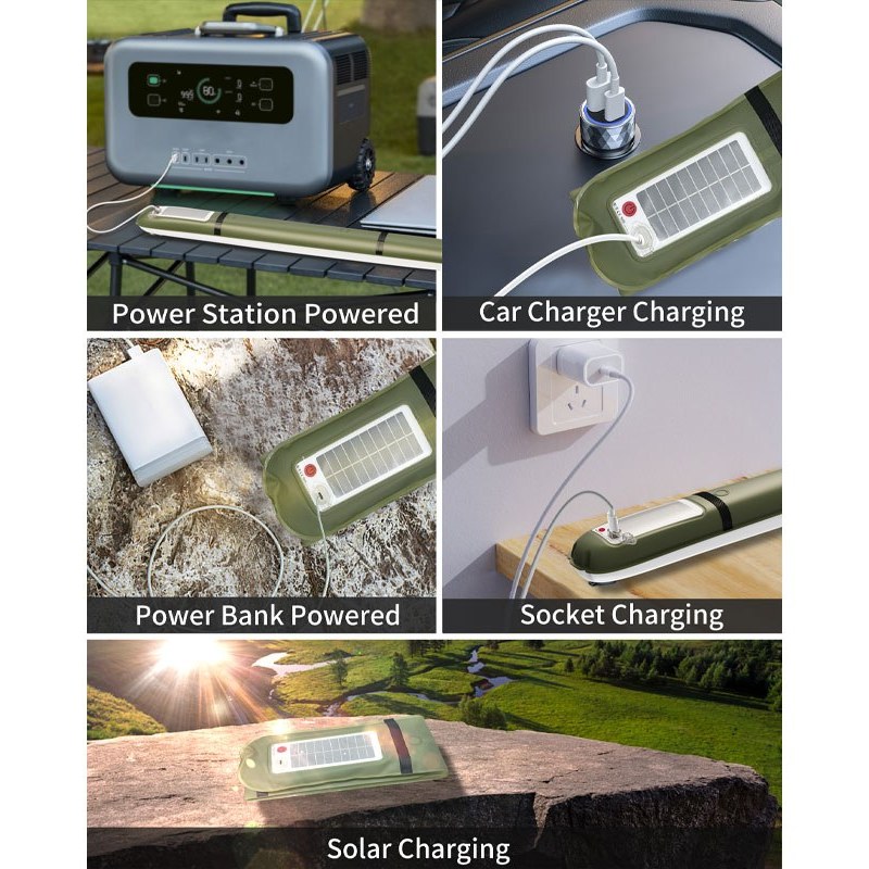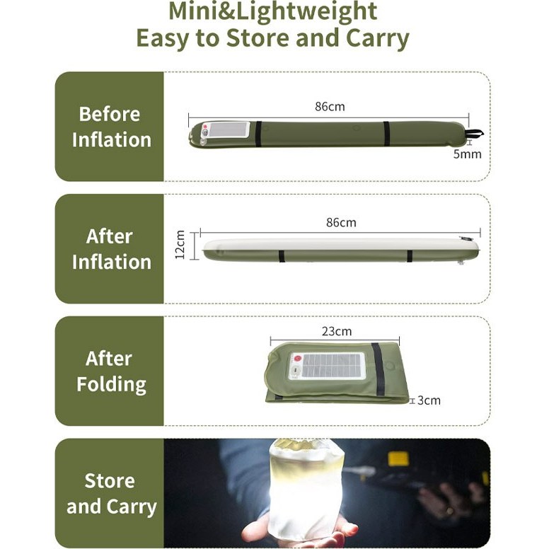 این چراغ لولهای بهطور کامل بادی ( Inflatable) بوده و از جنس TPU با دوام بالا ساخته شده است که با وزن سبک و قابلیت شارژ خورشیدی و پورت USB،ترکیبی از راحتی، مقاومت و نوردهی قوی را ارائه میدهد.