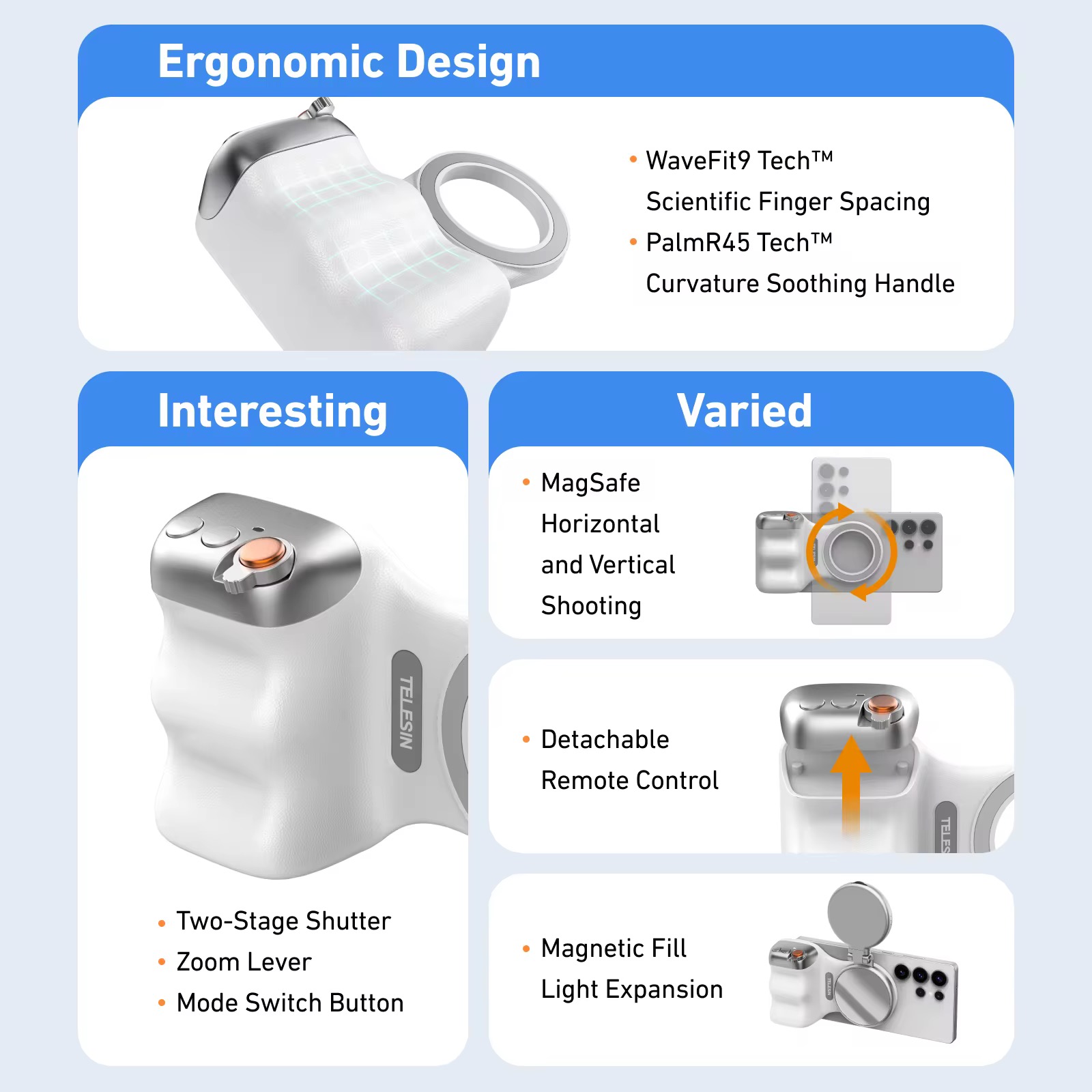 محصول فوق مدل جدید و ارتقا یافتهی گریپ مغناطیسی برند معتبر TELESIN است؛ ابزاری کاربردی برای عکاسی و فیلمبرداری حرفهای با موبایل. این گریپ با طراحی ارگونومیک، وزن سبک و اتصال مغناطیسی قدرتمند، تجربهای متفاوت از تولید محتوا را برای شما فراهم میکند.