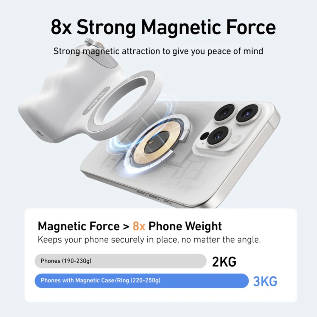 اتصال مغناطیسی قدرتمند با فناوری دوطرفهی مغناطیسی: گوشیهای دارای MagSafe یا مدلهای دیگر با حلقه مغناطیسی مخصوص بهراحتی به گریپ متصل میشوند.