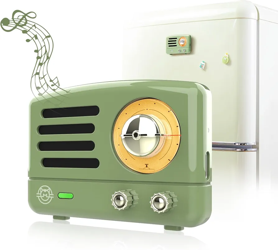 اسپیکری کوچک با ظاهری نوستالژیک است که برای استفادهی روزمره طراحی شده، بدنهی کمحجم و پشتی مغناطیسی امکان نصب آسان روی سطوح فلزی را میدهد و فضای کمی اشغال میکند. با بلوتوث 5.0 به سرعت به گوشی یا تبلت متصل میشود و کیفیت صدای شفاف تا حجم متوسط ارائه میکند.شارژ از طریق USB‑C انجام میشود و باتری عمر مناسبی برای استفاده کوتاهمدت دارد. مناسب برای کسانی که دنبال اسپیکر قابل حمل، سبک و با طراحی متفاوت هستند.