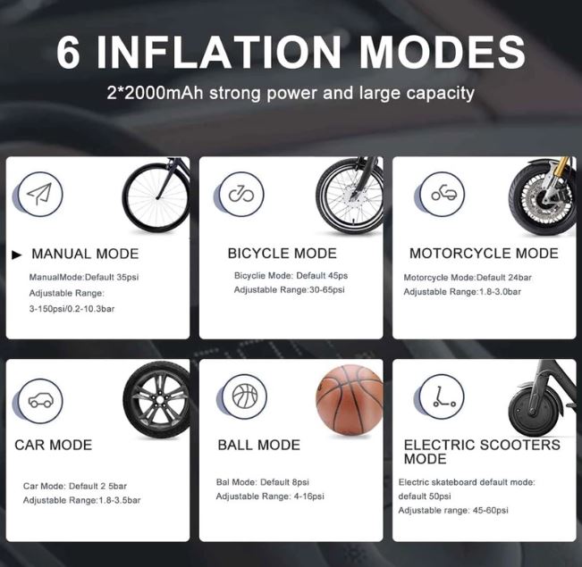 از بین مودهای پیشفرض این کمپرسور باد شیائومی، ۶ انتخاب پیش روی شما است. این شش مود، به شرح زیر هستند: