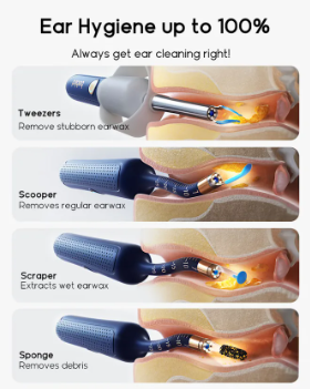 - پاکسازی دقیق انواع جرم: با داشتن مجموعهای از سریهای قاشقی، حلقوی و اسفنجی، میتوانید انواع جرم گوش (خشک، مرطوب یا روغنی) را به صورت هدفمند و ایمن خارج کنید.